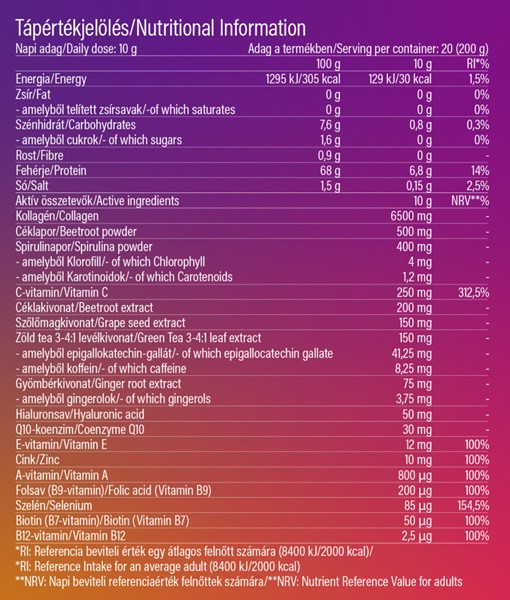 Málna ízesítésű hidrolizált marhakollagén alapú étrend-kiegészítő italpor, hozzáadott spirulinával, növényi kivonatokkal, hialuronsavval, Q10-koenzimmel, vitaminokkal és ásványi anyagokkal.